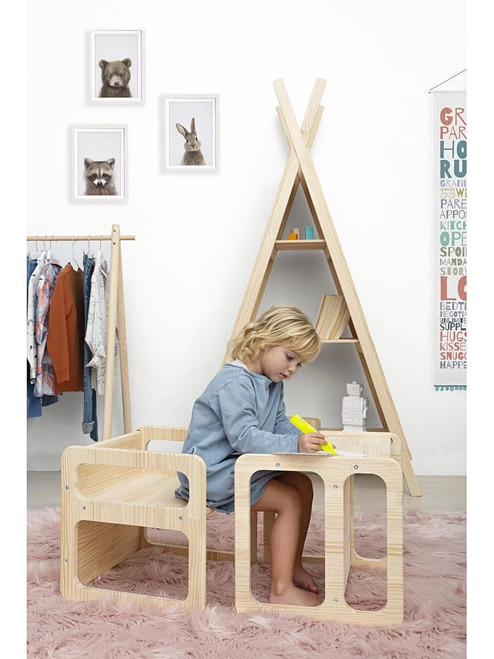 – je nach Position als niedriger Stuhl, Hochstuhl oder kleiner Tisch verwendbar