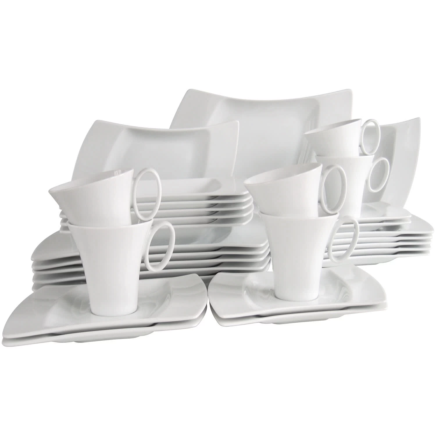 Das Geschirr präsentiert sich strahlend weiß im topaktuellen, geschwungenen Trapezdesign.