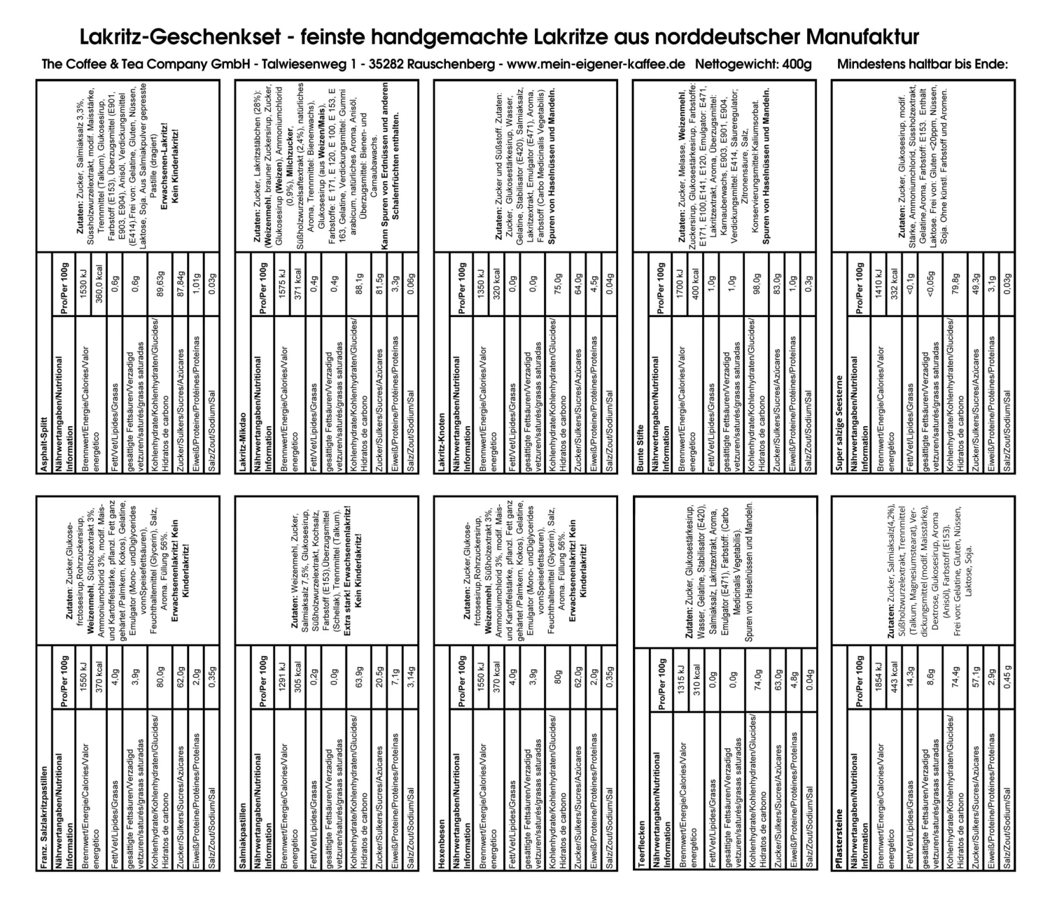 10 verschiedene Lakritz-Sorten in je 40g-Packungen (aromadicht in Kraftpapierbeuteln verschlossen)