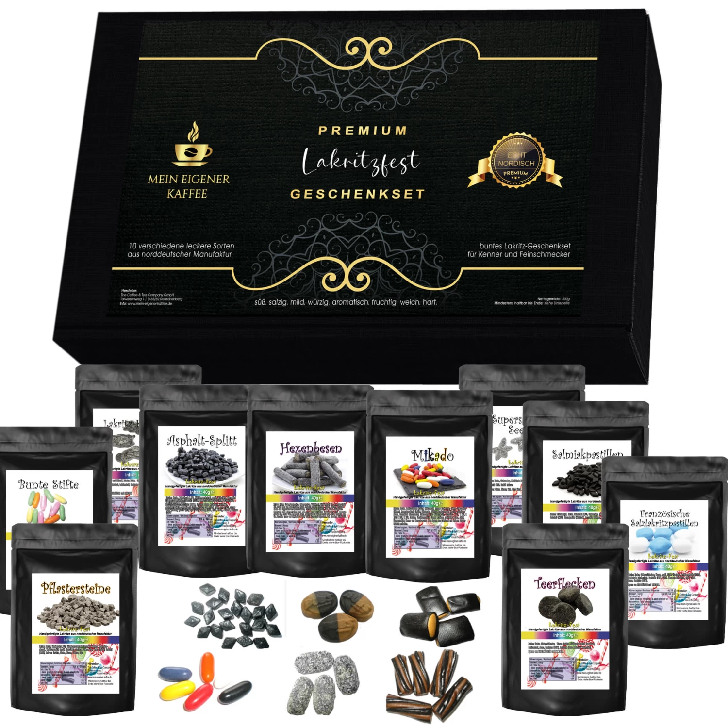 Lakritz Geschenk-Set mit 10x leckere Sorten in je 40g-Beutel, präsentfertig in hübscher Geschenkschachtel.